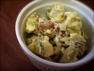 The main problem confronting me was the fact that it called for red potatoes, which I was sure I had none. After berating myself for not buying some on my last shopping trip and searching a bit more, unsuccessfully trying to rid the "Best Ever" salad from my mind, I decided to take a culinary leap of faith and make the salad using regular old russets. To my great delight and surprise, upon entering the pantry I found not only a stack of russets, but a bag of reds as well- it seems I had not failed myself at the grocery store after all.
